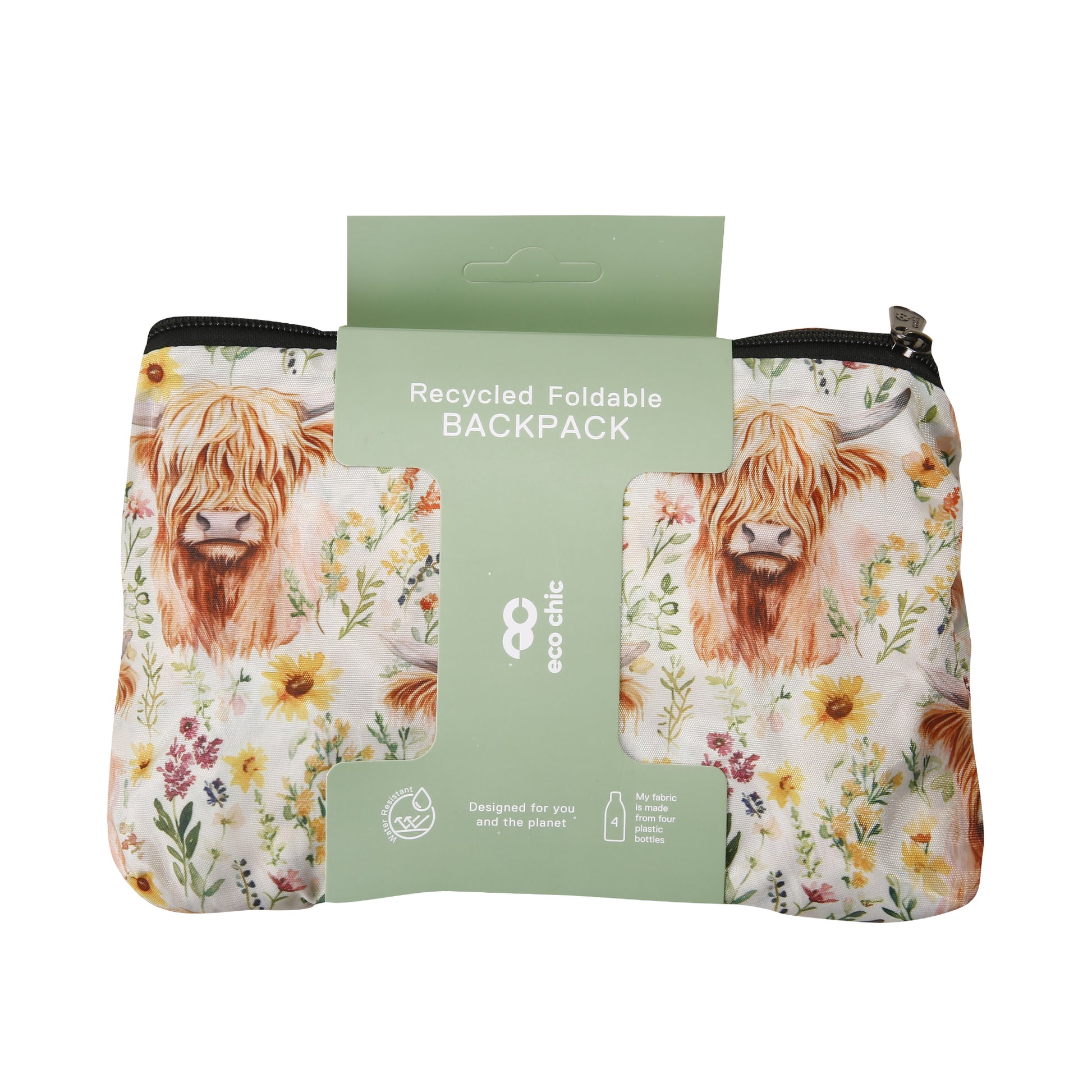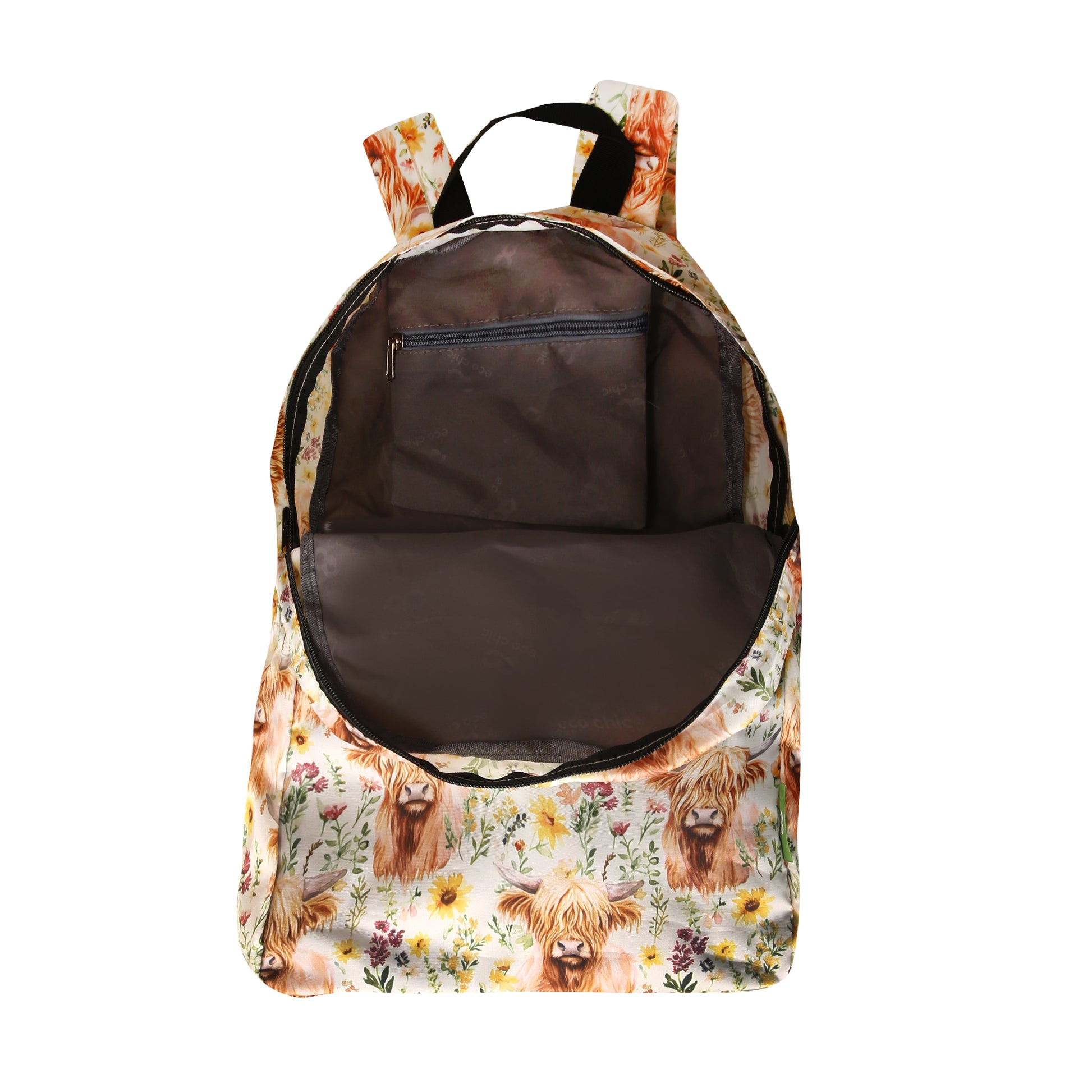 B116BG - Eco Chic Lightweight Foldable Backpack Floral Highland Cow Beige (Pack of 2)